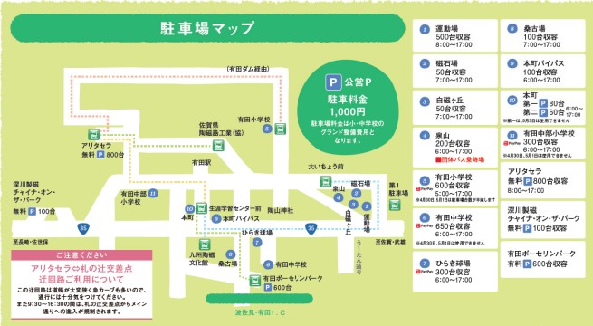 | 有田町役場臨時 | 無料 | 200台 | ◯ | 最寄りバス停まで徒歩2分 |