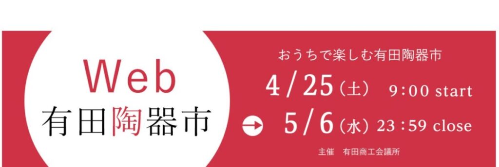 - 有田陶器市オンライン2026:4/25 9時スタート 〜 5/6 23時59分終了