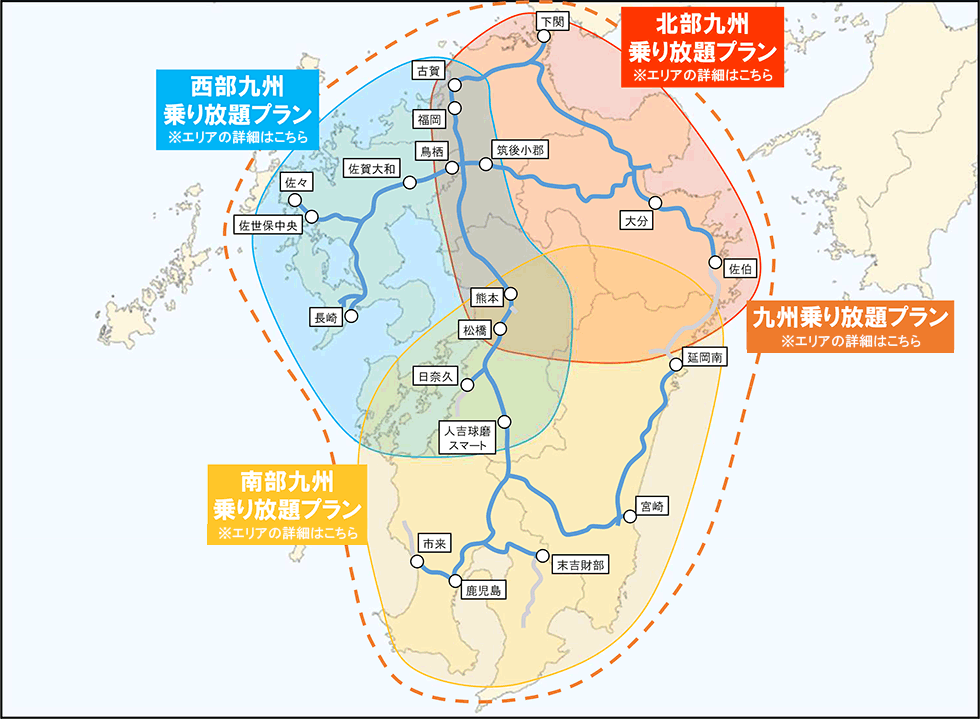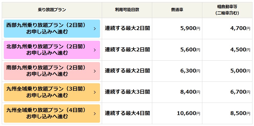 本ドライブパスは、予め設定されたエリアを周遊できる2日間プラン(西部九州・北部九州・南部九州)と九州全域を周遊できる3日間・4日間プランを選んでご利用できます。