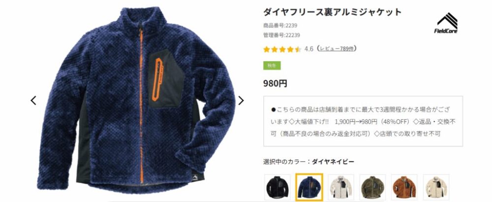 | 1位 | ダイヤフリース裏アルミジャケット(現行モデル) | 約1,900円/一部カラーは値下げで980円前後 | シリーズ後継。背中アルミ+ダイヤフリースで見た目と暖かさのバランスが良い |